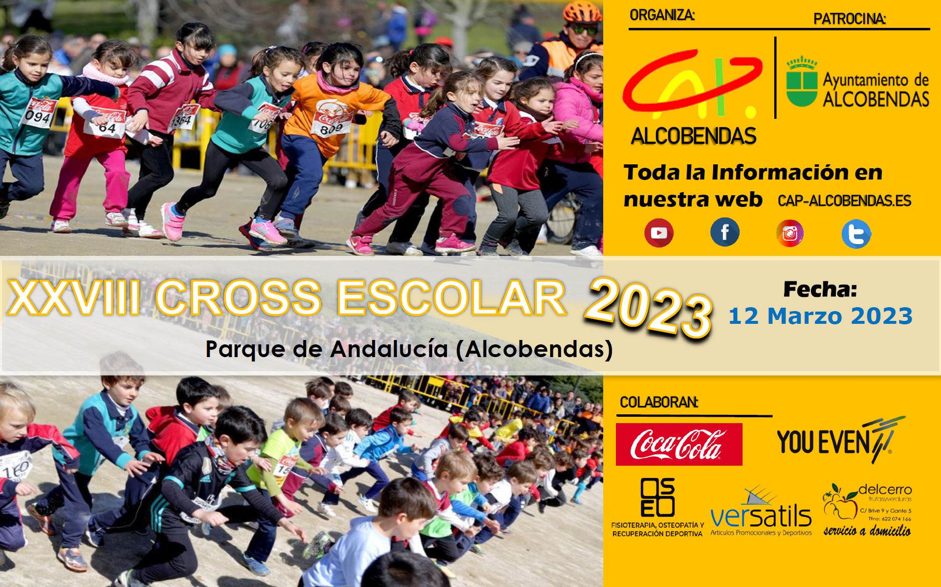 El Club de Atletismo Popular (CAP), con el patrocinio del Ayuntamiento de Alcobendas, organiza el XXVIII CROSS ESCOLAR. Esta prueba tendrá lugar el 12 de MARZO de 2023 a partir de las 10:30 horas en el Parque de Andalucía de Alcobendas.